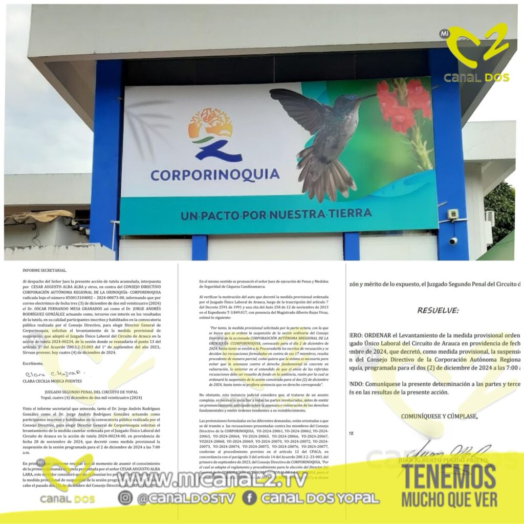 El Juzgado Segundo Penal del Circuito de Yopal revocó la medida cautelar que suspendía la sesión del Consejo Directivo de Corporinoquia, lo que permitirá que el proceso de elección del nuevo director de la entidad ambiental continúe.