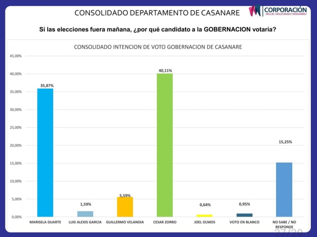 Según la Corporación MMM, quien mide hace ochos años las elecciones en Casanare, con resultados casi que calcados, en el consolidado general de intención de voto en todo el departamento, César Zorro tiene mayor favorabilidad con un 40,11 por ciento, frente a Marisela Duarte con un 35,87 por ciento, es decir que si se analiza el resultado se estaría frente a un empate técnico según el margen de error.