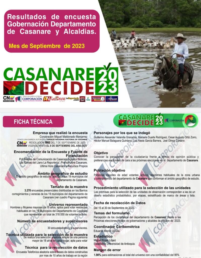 La medición que esta dando de que hablar, fue realizada por la Corporación Miguel Maldonado Manjarrez, una de las firmas encuestadoras que más ha acertado en las elecciones de la última década en Casanare.