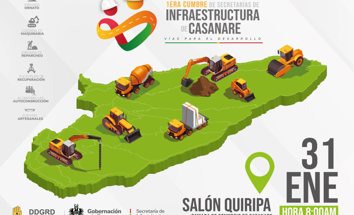 Con la participación de los alcaldes de los 19 municipios y los secretarios de Infraestructura, Obras y Planeación se llevará a cabo este miércoles 31 de enero desde la 9:00 a.m. en el Salón Quiripa de la Cámara de Comercio de Casanare, la Primera Cumbre de Secretarías de Infraestructura de Casanare, evento que contará con la presencia del gobernador César Ortiz Zorro.