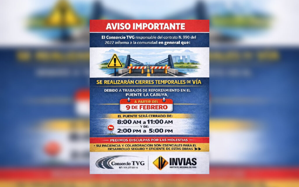 A partir de este 9 de febrero en el horario de 8 a 11 a.m, y 2 – 5 p.m. se tendrá restricción vehicular en el puente La Cabuya, ubicado en el kilómetro 2 de la vía que comunica a Yopal con Paz de Ariporo.