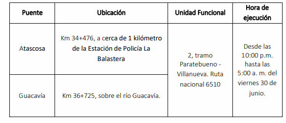 Las restricciones se realizarán de 10:00 p. m. a 5:00 a. m., desde el kilómetro 34 hasta el kilómetro 37 de la ruta nacional 6510, entre el sector del puente Atascosa y el sector del puente Guacavía, sentido Villavicencio – Yopal.