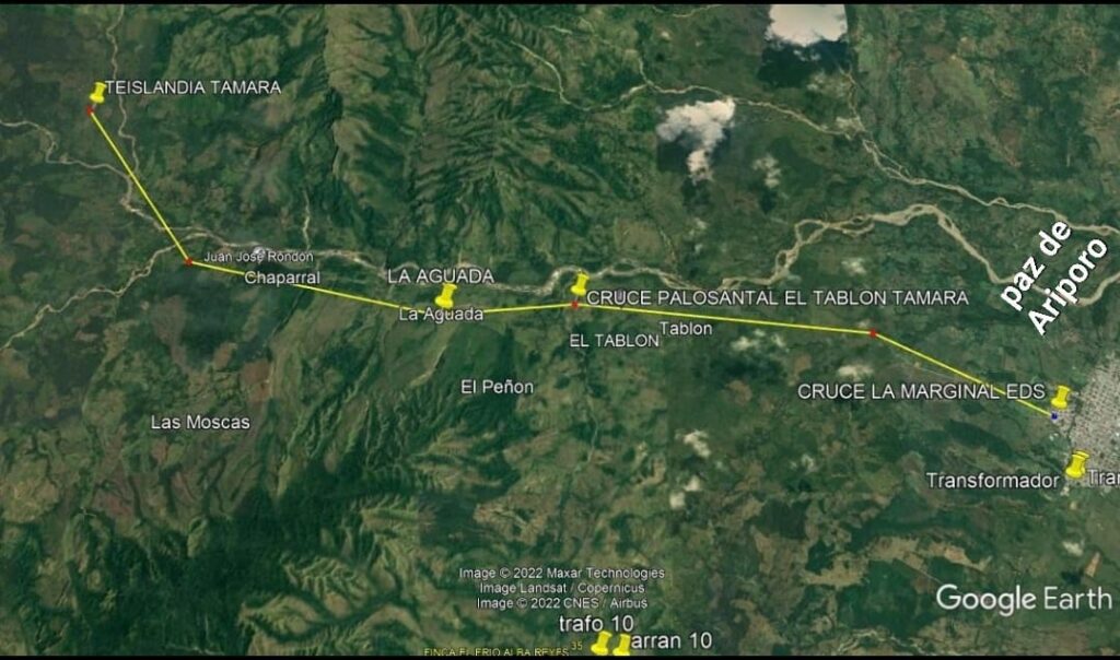 Ruta alterna la vía: Paz de Ariporo, vereda La Aguada, Teislandia (Támara), resguardo Barro Negro, El Degrero, puente La Cabuya sobre el río Casanare.