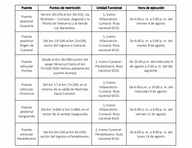 La Concesionaria Vial del Oriente – Covioriente, informa que entre el próximo viernes 4 y el lunes 14 de agosto, se presentarán restricciones en la movilidad para realizar pruebas de carga en 6 puentes ubicados en el tramo Villavicencio – Paratebueno, unidades funcionales 1 y 2 del proyecto vial.