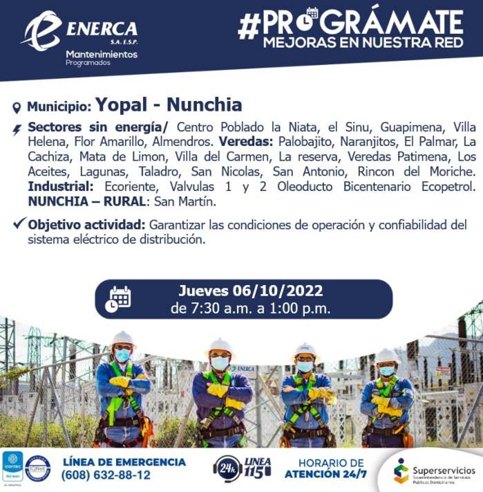 Los municipios de Yopal y Nunchía deben prepararse pues se van a realizar Trabajos de mantenimientos en el sistema eléctrico, habrá interrupción del servicio de energía el 6 de octubre 2022.