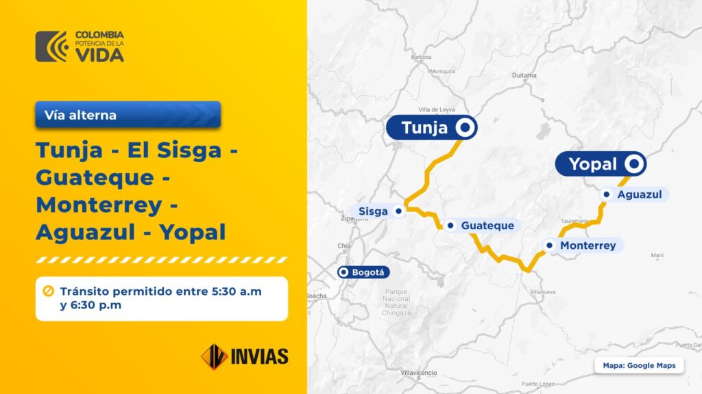 • Se recomienda a los usuarios de la vía tomar las siguientes rutas alternas: Bogotá Villavicencio-Monterrey-Yopal, para vehículos con peso inferior a 52 toneladas; la vía Tunja – El Sisga – Guateque – Monterrey – Aguazul -Yopal, para vehículos con