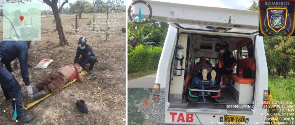 Tras el reporte de la emergencia, el personal de atención prehospitalaria del Cuerpo de Bomberos de Tauramena acudió al sitio para estabilizar al paciente.