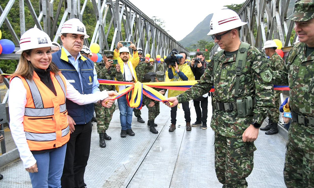 “Entregamos esta estructura, un puente metálico, modular semipermanente, con una longitud de 54,86 metros y una capacidad portante de 52 toneladas que cumple con los requisitos del Instituto Nacional de Vías”, explicó el general Jorge Hernández, comandante de ingeniero del Ejército