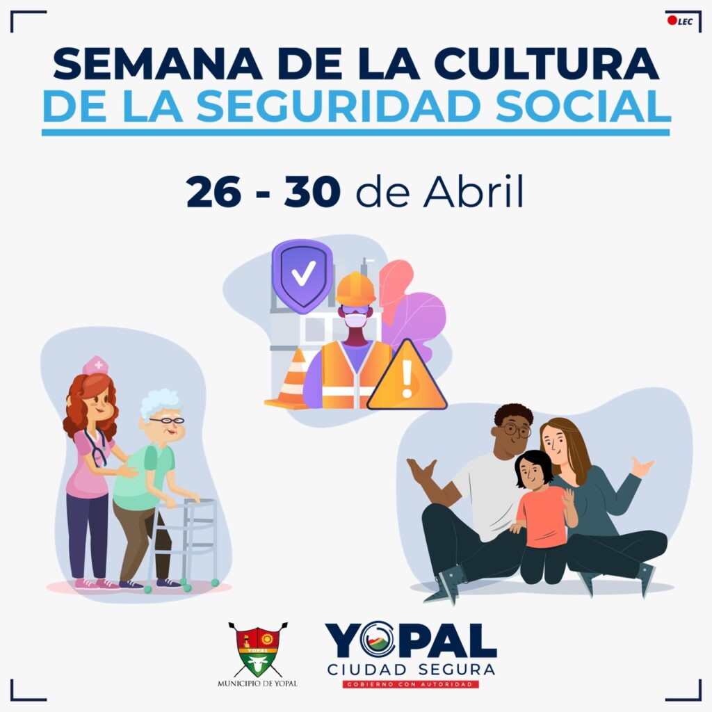 La Administración Municipal, Yopal Ciudad Segura, Gobierno con Autoridad, en cumplimiento a la ley 1502 de 2011, se une a la conmemoración de la «Semana de la Cultura de la Seguridad Social», bajo el lema «Todos somos parte del sistema de seguridad social. Mi compromiso engrandecerlo», la cual se desarrollará del 26 al 30 de abril. Entidades como: IDRY, Instituto de Cultura y Turismo de Yopal – ICTY, Secretaría de Educación Municipal, EPS, IPS, E.S.E. Salud Yopal – Hospital Local, ARL Positiva, Equidad,Colmena, SENA, Unisangil e INEC, se vinculan con actividades pedagógicas, lúdico -creativas, con las que se pretende promover el autocuidado, el conocimiento del sistema, los deberes y derechos de los ciudadanos y en especial, para que los actores del sistema reflexionemos sobre el papel en el funcionamiento del mismo.Estas acciones están orientadas al fortalecimiento para mejorar el sistema general de seguridad social, el desarrollo de capacidades de los ciudadanos para el cumplimiento de los deberes, la exigibilidad de sus derechos y la correcta utilización de los servicios.