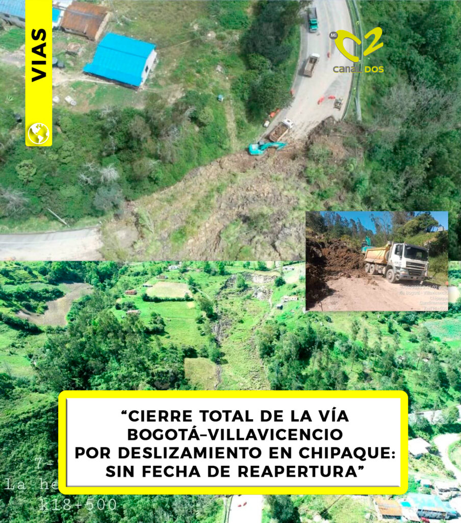 Un deslizamiento de gran magnitud mantiene cerrada la carretera Bogotá–Villavicencio a la altura del municipio de Chipaque (Cundinamarca), entre los puntos de referencia PR18+300 y PR18+600.