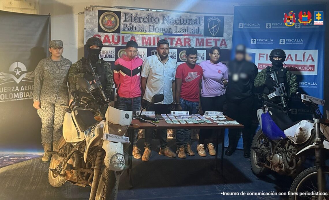 Por solicitud de la Fiscalía General de la Nación, un juez de control de garantías impuso medida de aseguramiento en centro carcelario contra tres hombres y una mujer, por su presunta responsabilidad en exigir dinero a pobladores de Puerto Gaitán (Meta), desde 2024. Un fiscal Gaula de la Seccional Meta les imputó el delito de extorsión a Jonathan Javier Pulido Perdomo, Wilmer Santiago Rojas Pacheco, Daniel Santiago Rivera Cruz y Flor María Bustillo Pacheco; quienes no aceptaron el cargo. El pasado 21 de enero, en la vía entre Puerto Gaitán y Rubiales (Meta) servidores del Cuerpo Técnico de Investigación, con apoyo del Gaula del Ejército Nacional y la Fuerza Aérea, capturaron en flagrancia a estas personas, después de haber recibido dos millones de pesos, de una de sus víctimas de extorsión, habitante del municipio. Los hoy procesados, al parecer, estaban exigiendo dinero a varios habitantes del oriente de Meta. A estas personas les incautaron dos motocicletas, cinco celulares, más de 7 millones de pesos y panfletos de un grupo armado ilegal y paz y salvos firmados por el presunto cabecilla de la organización.