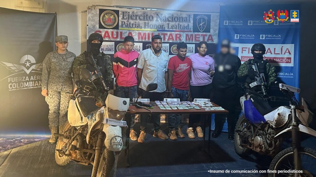 Por solicitud de la Fiscalía General de la Nación, un juez de control de garantías impuso medida de aseguramiento en centro carcelario contra tres hombres y una mujer, por su presunta responsabilidad en exigir dinero a pobladores de Puerto Gaitán (Meta), desde 2024. Un fiscal Gaula de la Seccional Meta les imputó el delito de extorsión a Jonathan Javier Pulido Perdomo, Wilmer Santiago Rojas Pacheco, Daniel Santiago Rivera Cruz y Flor María Bustillo Pacheco; quienes no aceptaron el cargo. El pasado 21 de enero, en la vía entre Puerto Gaitán y Rubiales (Meta) servidores del Cuerpo Técnico de Investigación, con apoyo del Gaula del Ejército Nacional y la Fuerza Aérea, capturaron en flagrancia a estas personas, después de haber recibido dos millones de pesos, de una de sus víctimas de extorsión, habitante del municipio. Los hoy procesados, al parecer, estaban exigiendo dinero a varios habitantes del oriente de Meta. A estas personas les incautaron dos motocicletas, cinco celulares, más de 7 millones de pesos y panfletos de un grupo armado ilegal y paz y salvos firmados por el presunto cabecilla de la organización.