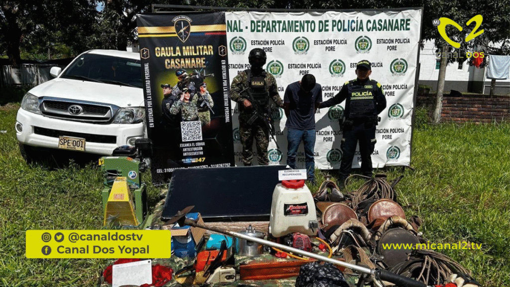 En una rápida acción conjunta entre la Policía Nacional y el GAULA Militar, fue capturado en flagrancia un hombre de 35 años señalado de participar en el hurto de una camioneta Toyota Hilux y varios objetos de valor en zona rural del municipio de Pore, Casanare.
