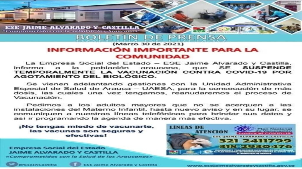 Así lo dio a conocer en un comunicado esa entidad que venía adelantando con éxito la vacunación de adultos mayores de 70 años, a tal punto que el día de ayer se lograron vacunar cerca de 120 personas. La crisis se generó debido a que, desde el Hospital San Vicente de Arauca, requirieron 50 dosis del biológico, que fueron entregadas por la E.S.E. Alvarado y Castilla, quedando sin existencias de vacunas para cumplir con las citas agendadas.