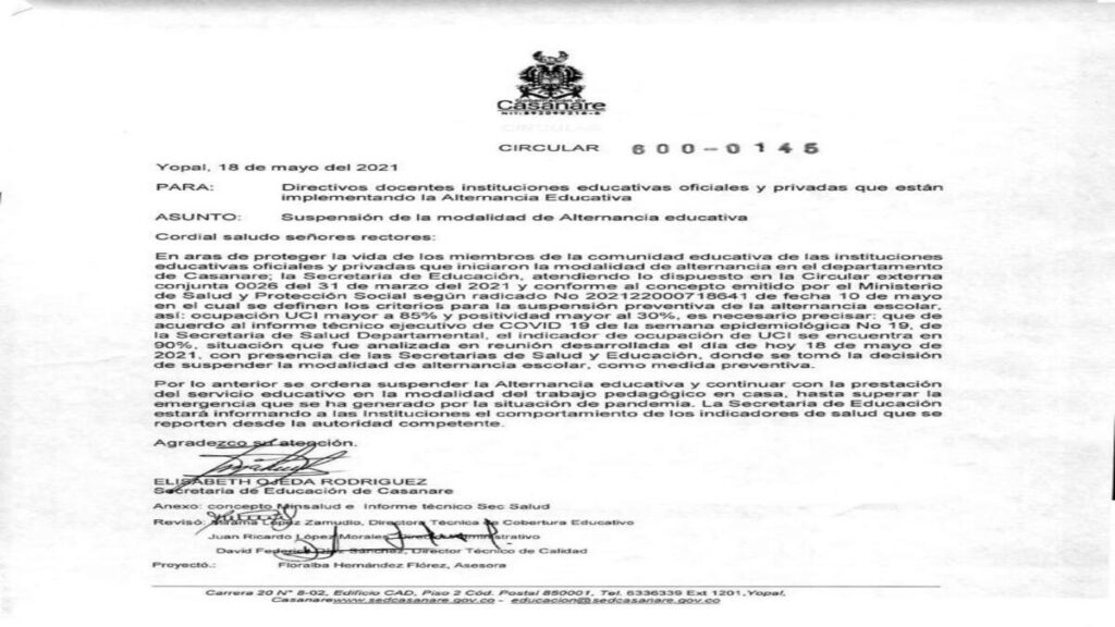 Mediante circular No 0145 del 18 de mayo de 2021, la Secretaría de Educación en cabeza de la licenciada Elisabeth Ojeda, solicitó a los directivos docentes de instituciones educativas oficiales y privadas que habían iniciado la implementación de la modalidad escolar, suspenderla y continuar con la prestación del servicio educativo en la modalidad de trabajo pedagógico en casa.