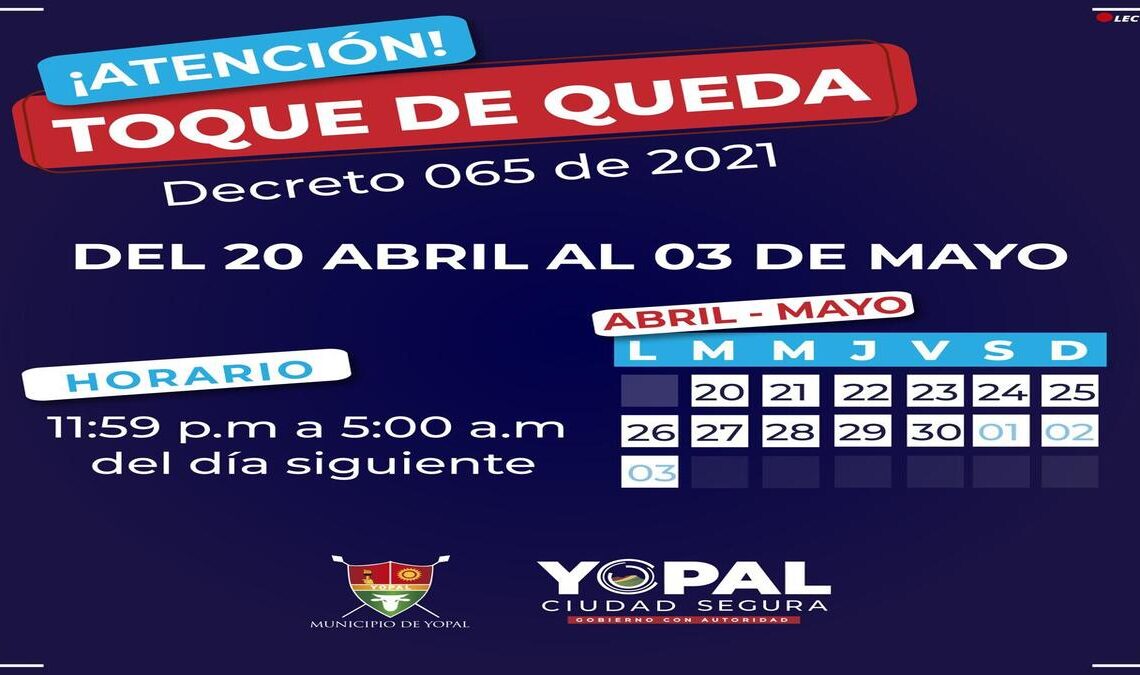 Este martes, la administración municipal a través de las Secretarías de Gobierno y Salud, socializaron el decreto 065 de 2021 el cual determinó toque de queda en Yopal a partir del martes 20 de abril hasta el lunes 03 de mayo, en el horario comprendido desde las 11:59 de la noche hasta las 5:00 de la mañana del día siguiente.