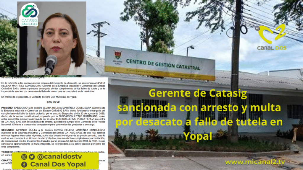 El Juzgado Tercero Civil Municipal de Yopal sancionó a la gerente de Catasig, Elvira Helena Martínez Consuegra, con tres días de arresto y una multa de tres salarios mínimos por no acatar un fallo de tutela interpuesto por la Fundación Little Guardians.