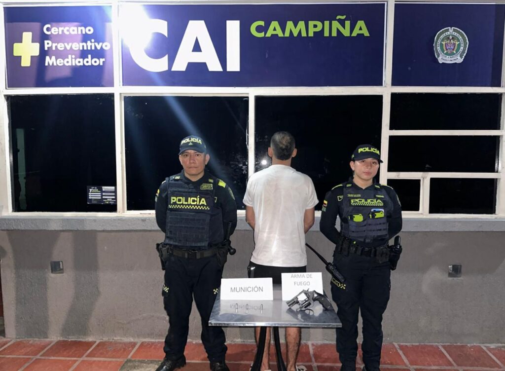 Durante el registro personal, los uniformados le hallaron en la pretina de su pantaloneta un revólver traumático calibre 38, acompañado de tres cartuchos modificados sin percutir. Al solicitarle la documentación que acreditara la legalidad del arma, el sujeto manifestó no poseerla.
